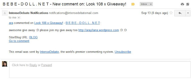 - Refer her blog to your friend. They too will have a chance to win the giveaway. And if you found out about this giveaway at this blog, please include this - "Referred by lovesiee.blogspot.com" at this point into your comment section on her post. Once the entry reach 15 people, she will then choose the lucky winner. NOTE: The more people you refer, the more entry you'll get.